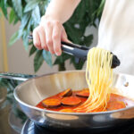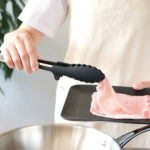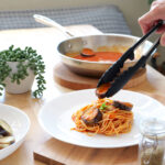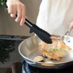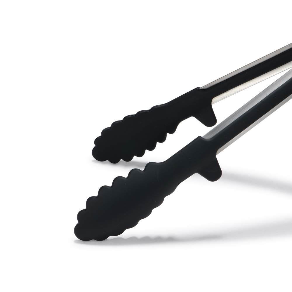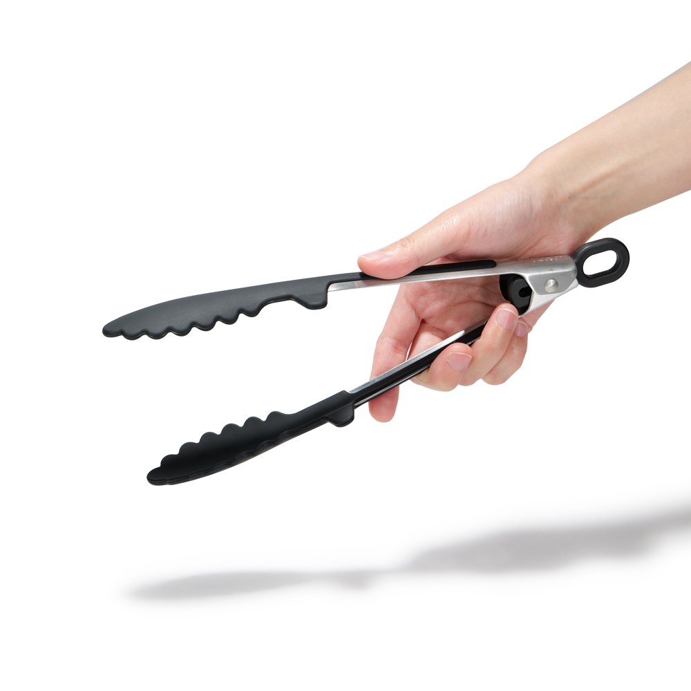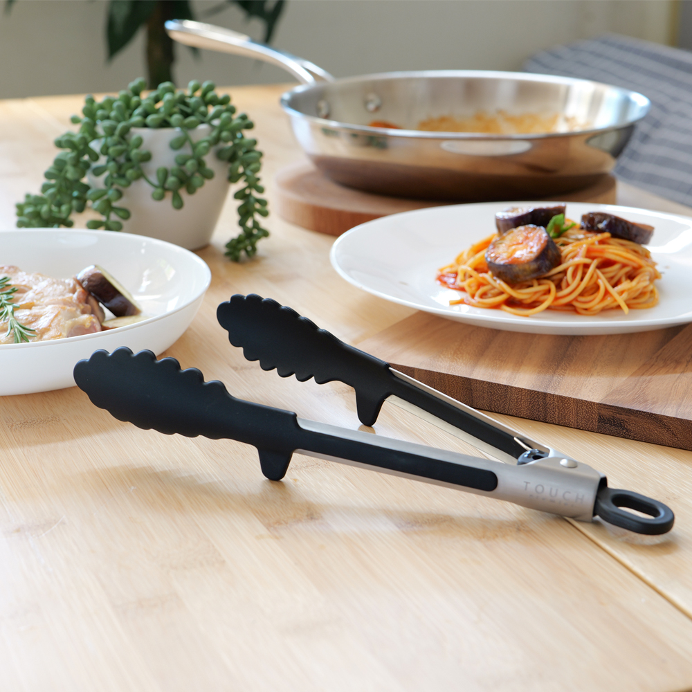 フライパンを傷つけにくい耐熱シリコーン製 先端には耐熱性の高いシリコーン素材を採用。フッ素樹脂加工のフライパンや鍋を傷つけにくく、パスタや大きな肉などの食材もしっかりと掴めます。